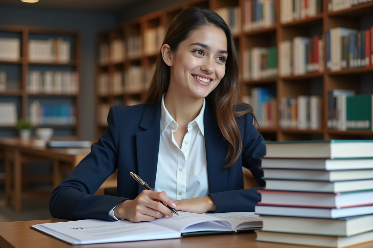 Jeune femme en bibliothèque universitaire avec livres de finance